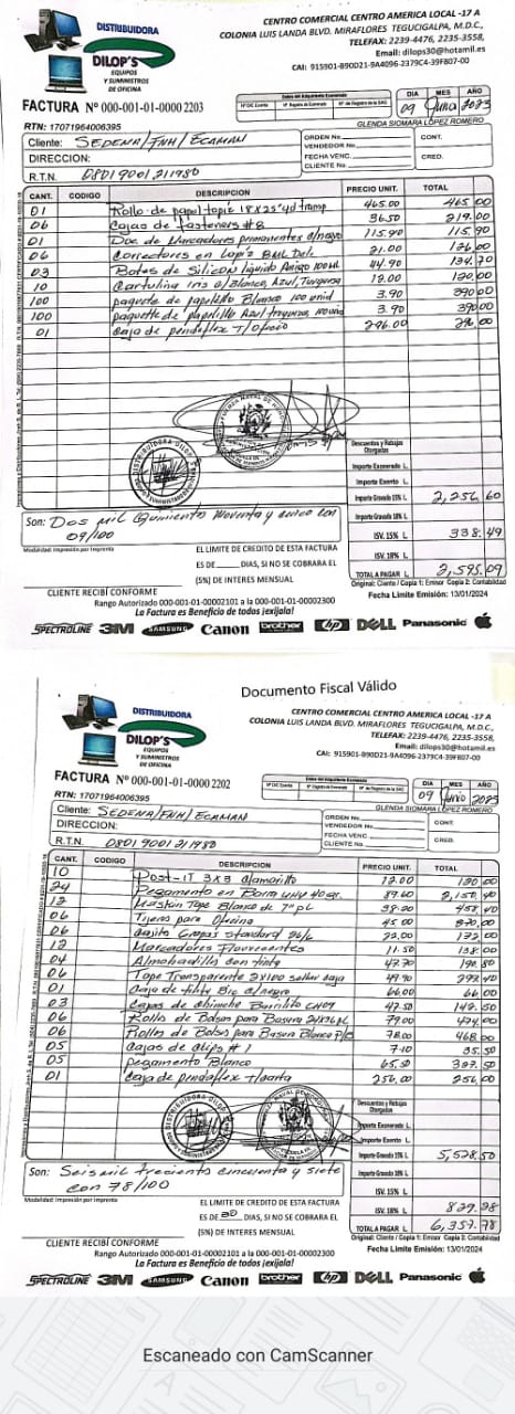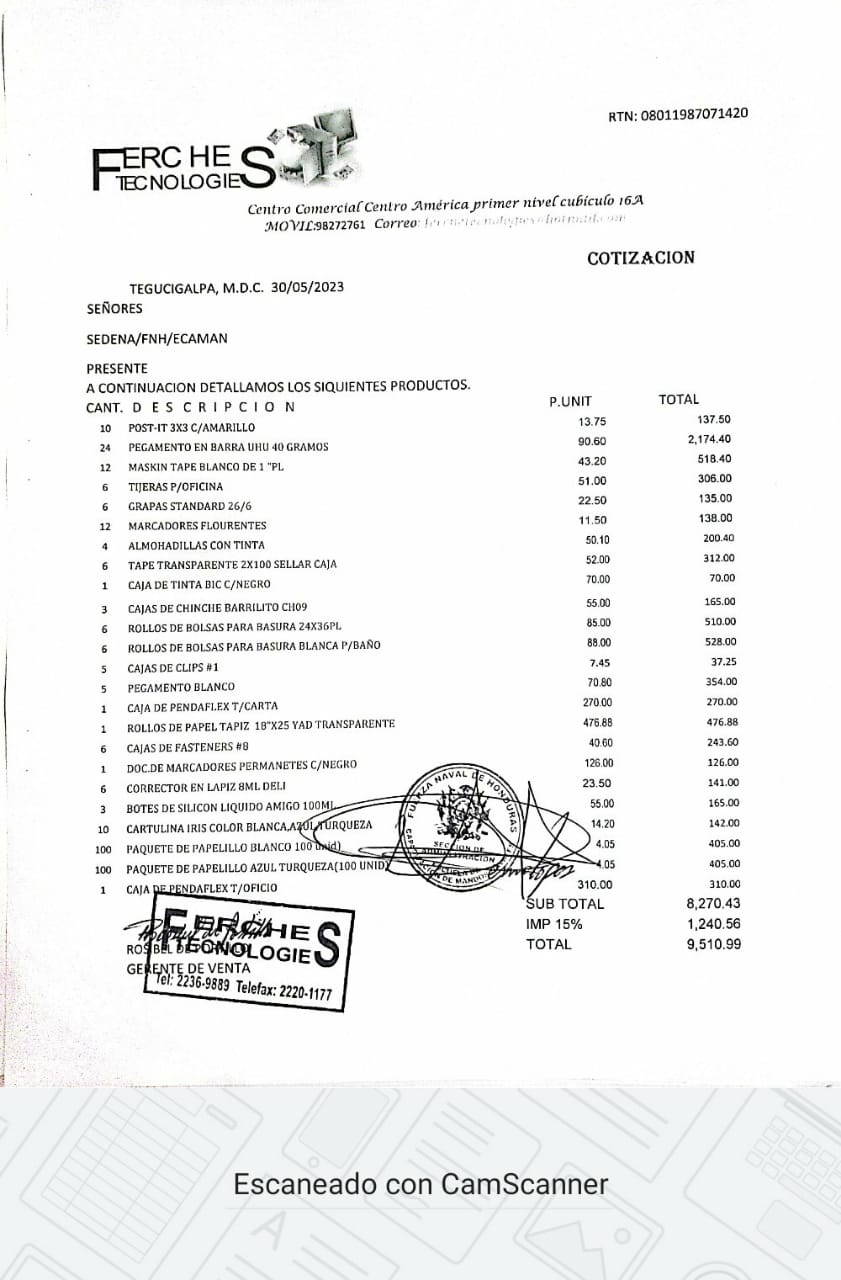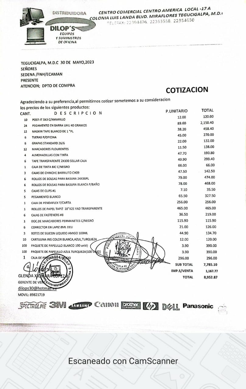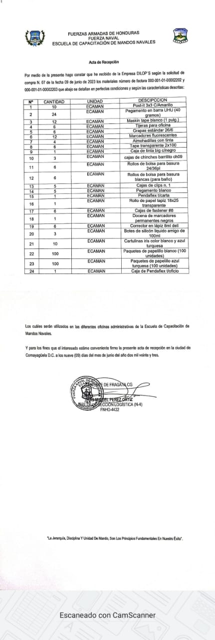 "description": "*LAS OFERTAS DEBERAN DE SER SELLADAS ENVIADAS AL CORREO ELECTRONICO:dirección.ecaman@gmail.com Y EN FISICO EN SOBRE SELLADO EN LAS INSTALACIONES DE la escuela de Capacitación de Mandos Navales 200 MTS DESPUES DE LA UNIVERSIDAD CATOLICA EN LA FUERZA NAVAL DE HONDURAS,NO SE ACEPTAN COTIZACIONES FUERA DE LOS PLAZOS ESTABLECIDOS,NO SE ACEPTAN OFERTAS PARCIALES DE LOS ARTICULOS SOLICITADOS,SE SOLICITA CREDITO DE 30 DIAS,EL OFERENTE GANADOR DEBERA DE ENTREGAR DE MANERA INMEDIATA LOS PRODUCTOS EN LA BODEGA DE la ECAMAN, NO SE ACEPTAN ARTICULOS CUYA FECHA DE VENCIMIENTO SE PROXIMA, NO SE ACEPTAN OFERENTES QUE NO CUENTEN CON LA SIGUIENTE DOCUMENTACION VIGENTE:PAGOS A CUENTA,SOLVENCIA FISCAL,CONSTANCIA ONCAE O EN TRAMITE DE INSCRIPCION,CONSTACIA SIAFI,PERMISO DE OPERACION,EN CASO DE NECESITAR MUESTRA SE PROGRAMARACITA*10 POST-IT 3X3 AMARILLO,24 PEGAMENTO EN BARRA UHU 40GR,12 MASKIN TAPE BLANCO DE 1 PULGADA,06 TIJERAS PARA OFICINA,06 CAJITAS DE GRAPAS STANDARD 26/6,12 MARCADODERES FLOUROSENTES,4 ALMUADILLAS CON TINTA,06 TAPA TRANSPARENTE 2X100,01 CAJA DE TINTA BIC COLOR NEGRA,03 CAJAS DE CHINCHE BARRILITO CH09,06 BOLSAS PARA BASURA 24X36,06 ROLLOS PARA BASURA BLANCA P/S,05 CAJAS DE CLIPS #1,05 PEGAMENTOS BLANCO,01 CAJA DE PENDAFLEX T/CARTA,01 ROLLO DE PAPEL TAPIZ 28X25 TRANSPARENTE,06 CAJAS DE FASTENERS #8,01 DOCENA DE MARCADORES PERMANENTES COLOR NEGRO,06 CORRECTORES EN LAPIZ 8 ML DELI,03 BOTES DE SILICON LIQUIDO AMIGO 100ML,10 UNIDAD DE CARTULINA IRIS BLANCO,AZUL Y TURQUESA,100 UNIDADES DE PAPELIO BLANCO,100 UNIDADES DE AZUL TURQUESA,01 CAJA DE PENDAFLEX T/OFICIO.",